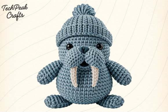 Textured yarn details and winter accessories give this walrus graphic authentic handmade character combined with digital convenience. The pom-pom hat adds playful personality while signature tusks maintain recognizable features.