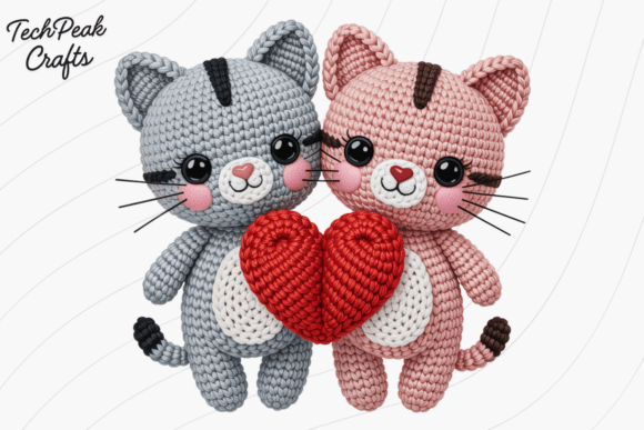Romantic warmth radiates from this coupled cats design where two amigurumi felines share a bright red heart. Soft pastel tones and expressive faces create genuine sweetness perfect for Valentine’s Day applications.