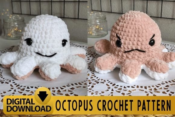 Reversible design innovation distinguishes this octopus pattern that features two different faces in one creation. The dual-sided approach adds interactive play value and creative satisfaction to the finished piece.