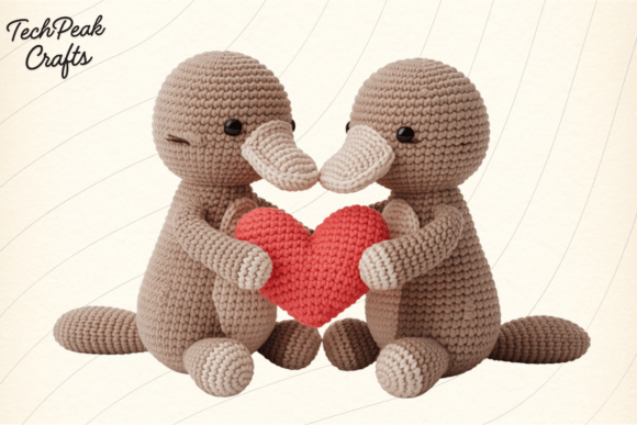 Soft yarn textures and gentle romantic imagery come together in this Valentine-focused design featuring two platypuses sharing a crochet heart. The neutral color palette with red accent creates warmth without overwhelming sweetness.