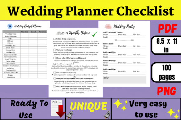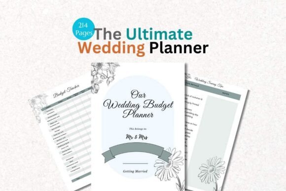 Not sure where to even begin? This planner was literally built for that feeling. Its 214 unique pages start with a couple’s love story board and wedding questionnaires — helping you get clear on your vision before diving into logistics. From there, it walks you through saving tips, supplier comparisons, on-the-day emergency kits, ceremony processional line-ups, and even a kids’ activity worksheet. A bonus Excel budget file and PLR rights sweeten the deal for anyone who also wants to sell or share this planner. Fun, practical, and beautifully comprehensive.