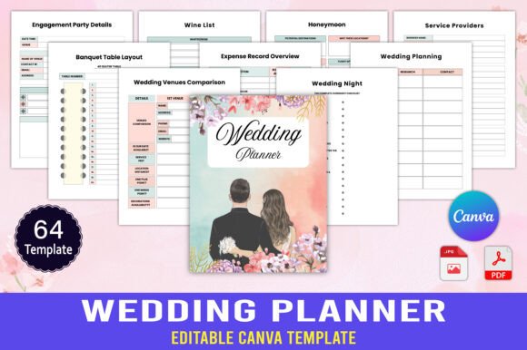 This beautifully structured 70-page planner treats wedding planning like the epic project it truly is — breaking everything into manageable, visually clear steps. Unique features include venue comparison sheets for up to 4 venues side by side, a transportation planner with logistics and timing, a gift registry and thank-you tracker, and a bridal appointments section for beauty schedules and fittings. Seating charts come in both round and banquet table formats. The Canva template is fully editable, and the included high-quality JPG files make sharing previews on social media a breeze.