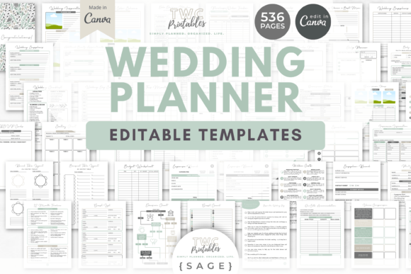 Imagine building your dream wedding planner from scratch — choosing every color, every font, every layout — with no design experience required. That’s exactly what this Canva template set makes possible. With 536 editable templates in a fresh sage palette (though you can change absolutely everything), this is the most flexible planning system on this list. Covers arrive paired with elegant dividers, wedding timelines flow into calendar views, and bonus materials like vendor comparison sheets and kids’ activity pages round out an already incredible package. All you need is a free Canva account — and a little imagination.