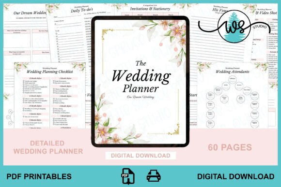 Clean. Elegant. Perfectly organized. These 60 printable planner pages by White Spruce Studio strike the ideal balance between completeness and simplicity — giving you everything you need without overwhelming you with unnecessary extras. Highlights include a decor moodboard page, color palette tracker, his and hers vow writing pages, seating logistics, vendor comparison sheets, and a handy emergency bag checklist for the big day. The pages are designed with hole-punch margins so they slot straight into any binder, and they’re compatible with Goodnotes for digital use too. A lovely, practical planner for every type of bride.