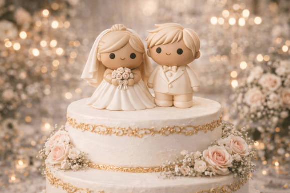 This tiny couple packs an enormous amount of warmth into a very small print. The soft, round kawaii proportions and minimal facial features give the topper a universally charming quality â recognizable as a bride and groom, but with a gentleness that feels inclusive and sweet rather than overly specific. The details are there: the flowing veil, the neat suit, the little bouquet, the tender pose. It just feels right.